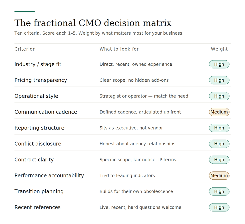 Use this to score the fractional CMOs you're considering. Rate each criterion 1–5; weight by what matters most for your business.